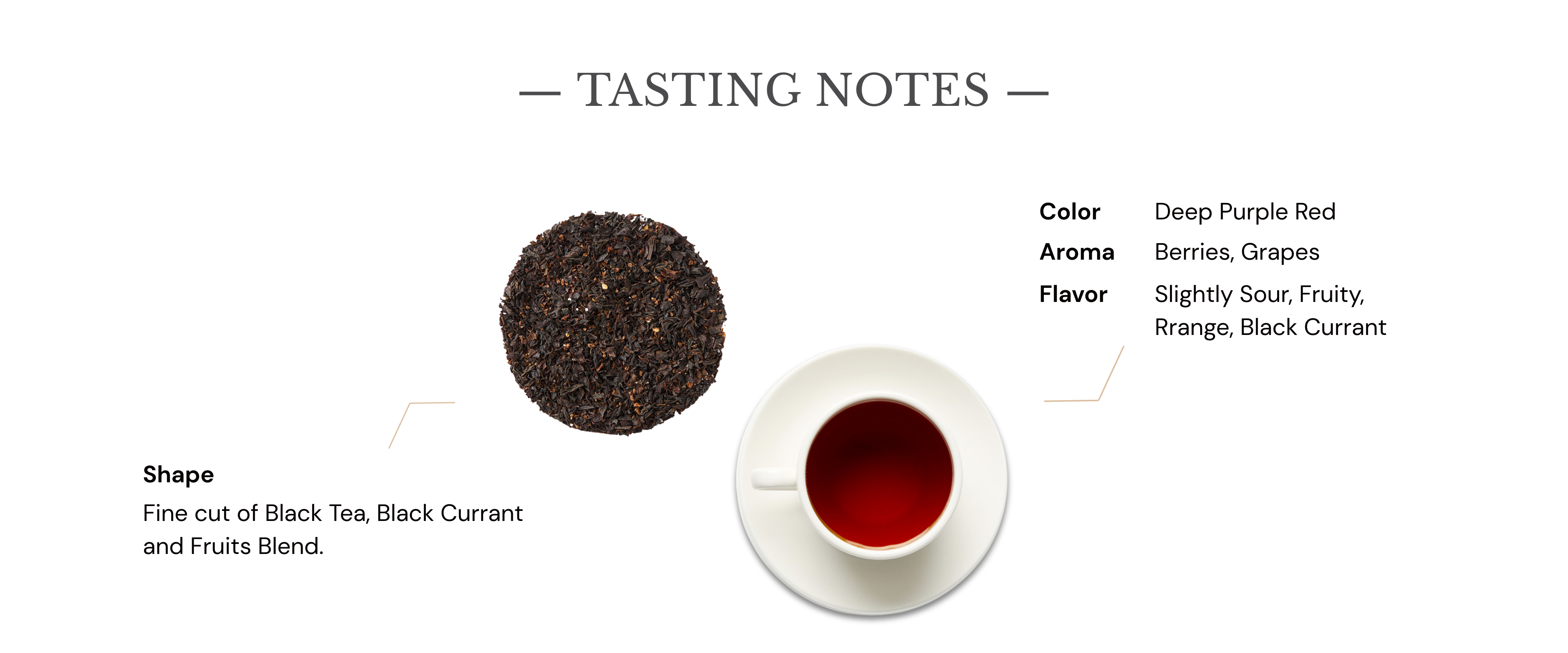茶湯呈深紅色,散發出迷人的果香。啜飲時會先感受到濃郁的莓果香氣,如同置身於一片果樹叢中。微酸的口感輔以甜美的果香,讓每一口都充滿了驚喜,帶來層次豐富的漿果及柑橘香氣的絕妙平衡。