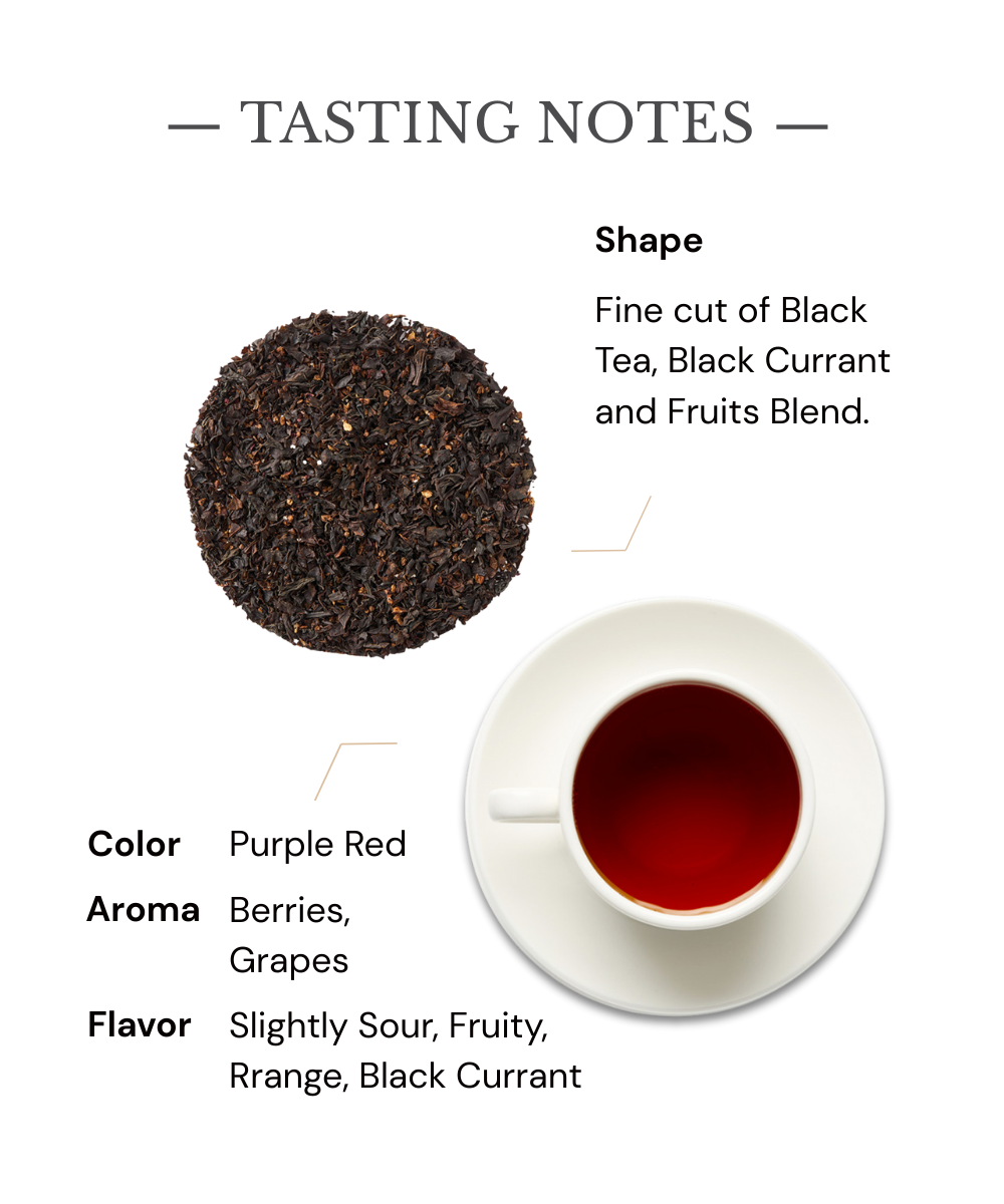 黑醋栗果香為茶湯注入了一股暖意,適合在一個慵懶的午後時光享用,就像冬日裡一杯暖茶帶來溫暖的情感,讓人不禁想起那些平凡中蘊含幸福的小確幸。