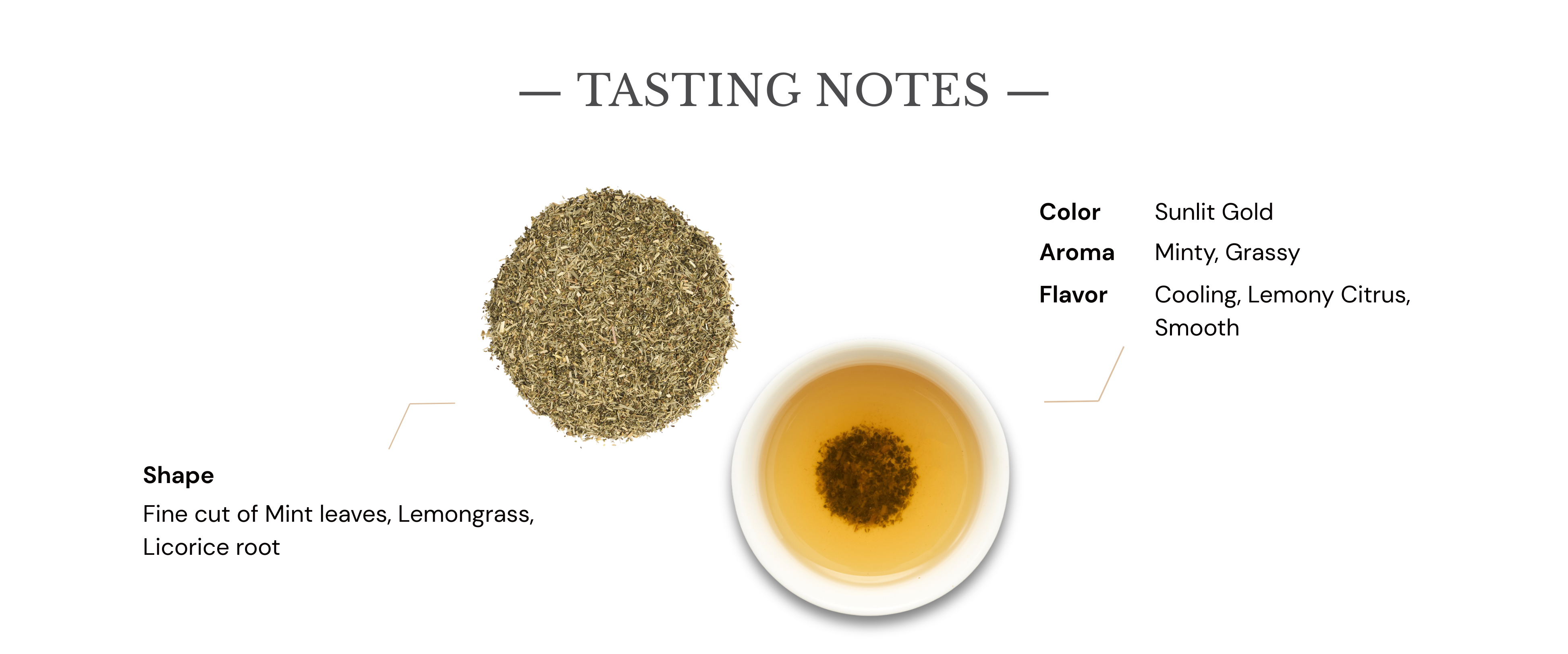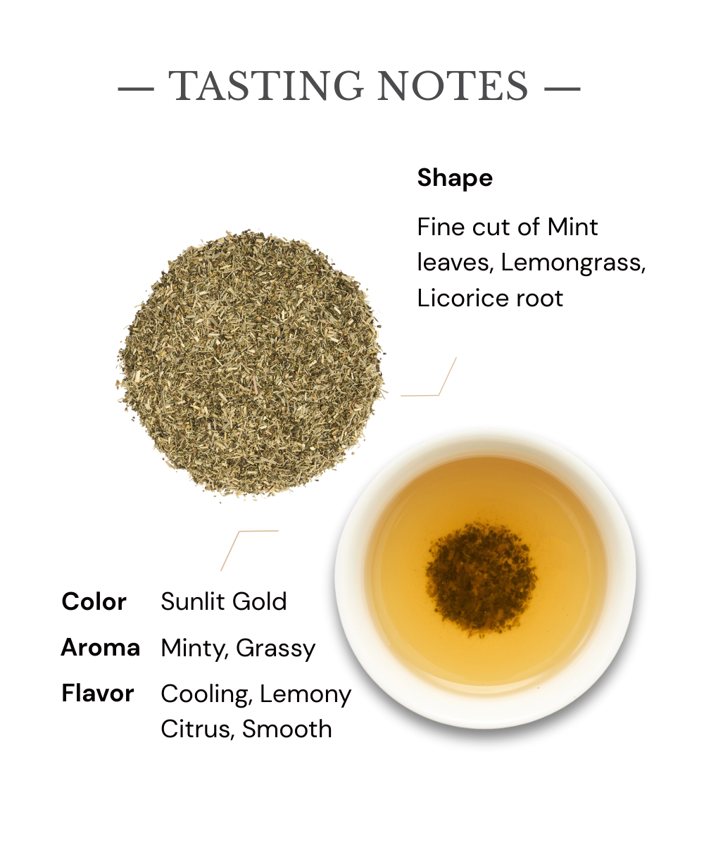 茶湯清透淡金,入口首感為薄荷的透涼清爽,隨後滲入檸檬草的柑橘香氣,最後由甘草根的自然甘甜包覆收尾,口感層次豐富且圓潤。入喉清新醒腦、尾韻甘甜回旋,輕盈中帶來平衡與舒暢。