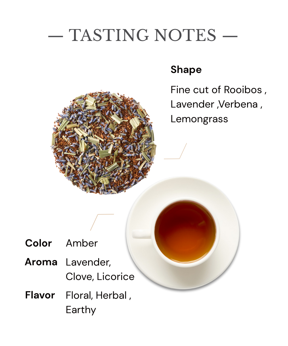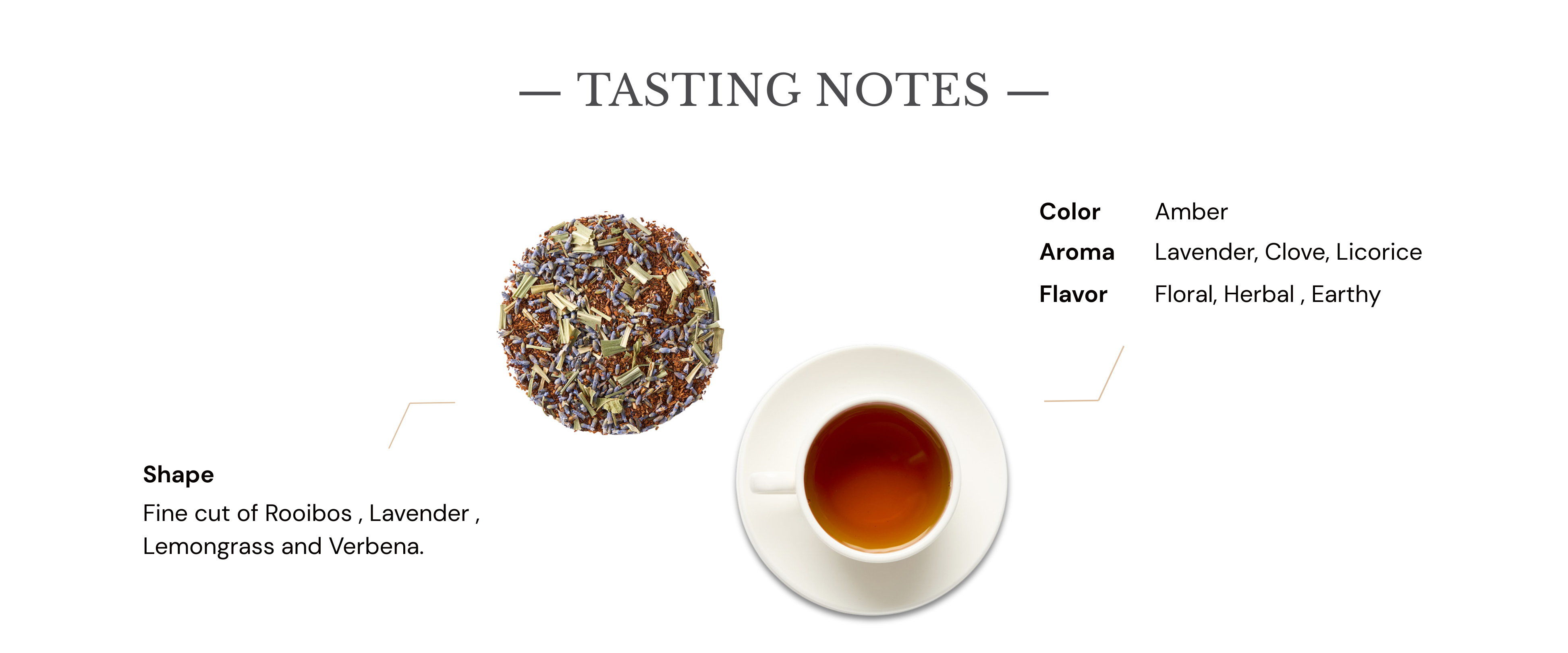 馬鞭草是一種具有強烈草本香氣的植物,常見於摩洛哥的傳統薄荷茶中。檸檬草以其鮮明的檸檬香氣和清新口感而聞名,在東南亞的料理中被廣泛應用。將兩種風味鮮明的草本植物,以優雅的法國薰衣草串聯,再搭配味道溫和、口感順滑的南非國寶茶來平衡,創造出一款在不同文化特色下的層次風味。