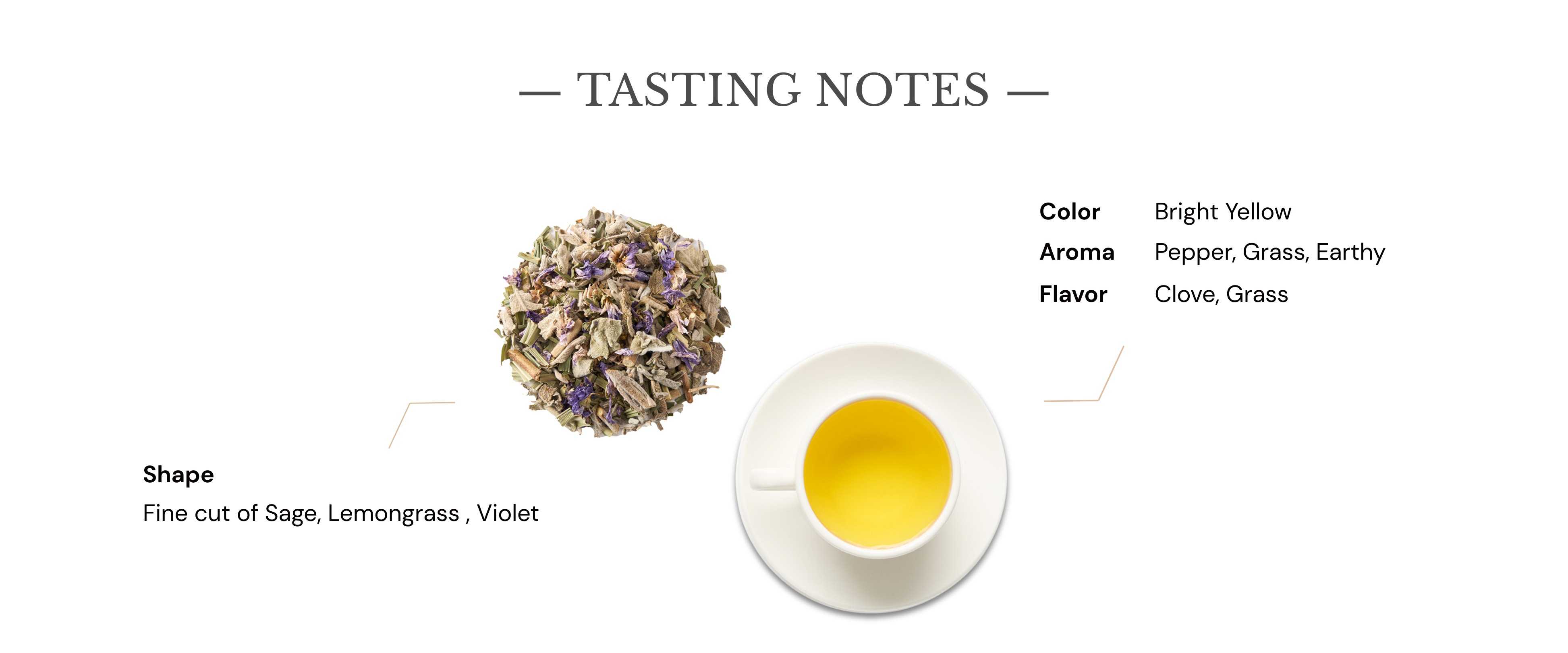 入喉時可以感受檸檬草的清爽氣息,鼠尾草的草本香氣與微妙的胡椒風味緩緩浮現,帶來一股涼爽且安定的感受。茶湯細膩,紫羅蘭的淡雅花香讓人彷彿置身於海島的微風中,整體口感清新自然,令人身心舒緩。